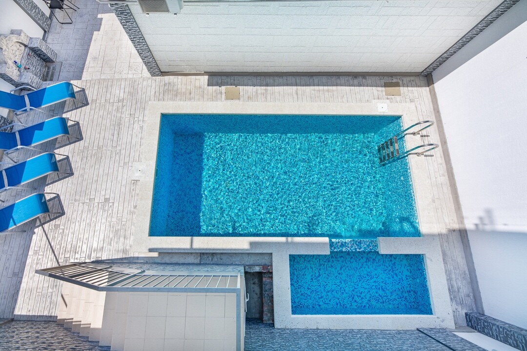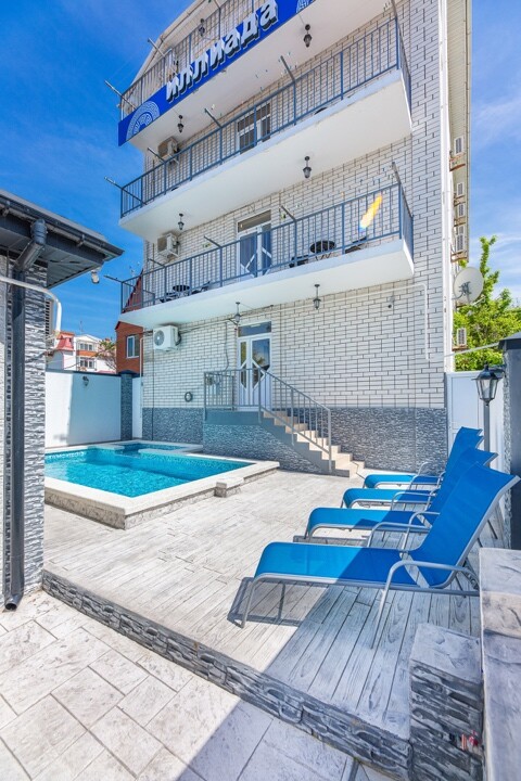 На кухне есть всё необходимое для приготовления пищи самостоятельно. На территории есть чистый, небольшой и теплый бассейн. С парковкой не очень удобно, мало машиномест. Пришлось ждать свободное место. Но локация гостиницы вполне удобная. Рядом есть столовые, небольшие магазинчики. До пляжа/центра 20 минут пешком