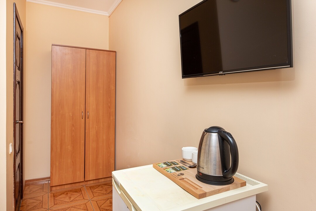 На кухне есть всё необходимое для приготовления пищи самостоятельно. На территории есть чистый, небольшой и теплый бассейн. С парковкой не очень удобно, мало машиномест. Пришлось ждать свободное место. Но локация гостиницы вполне удобная. Рядом есть столовые, небольшие магазинчики. До пляжа/центра 20 минут пешком